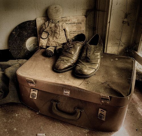 تجمع هذه الصورة بين عناصر من الماضي، وكأنها صندوق كنوز من حياةٍ مضت. الحقيبة القديمة تحمل علامة “SINGER”، ربما كانت لآلة خياطة أو لرحلة بعيدة. الأحذية الجلدية والدُمية المحبوكة يضيفان لمسة شخصية، كأنهما شاهدا على طفولة أو سفر. ورقة النوتة الموسيقية بعنوان “Loch Lomond” تهمس بألحان من أرض الأسكتلنديين. في هذا الركن المهمل، تنبض الذكريات وتُروى القصص بصمت الأشياء.